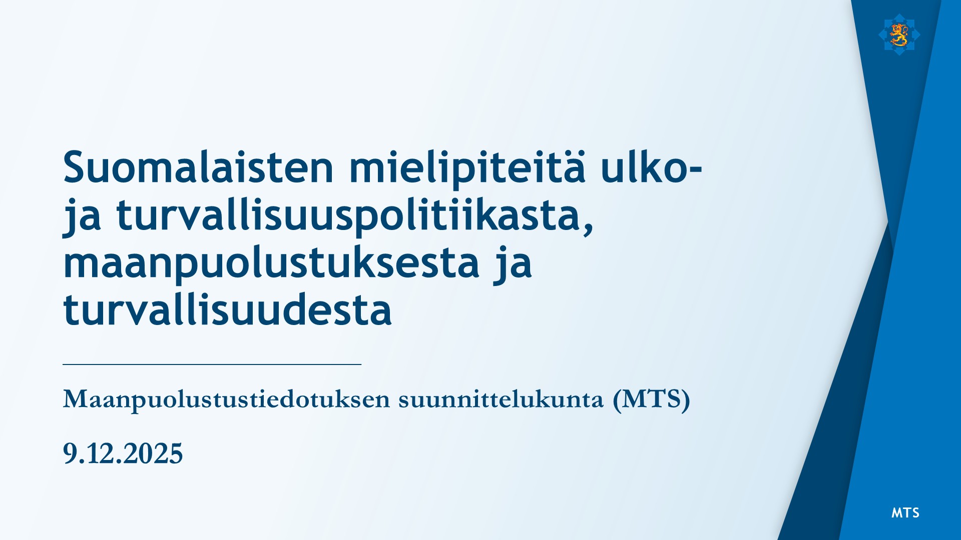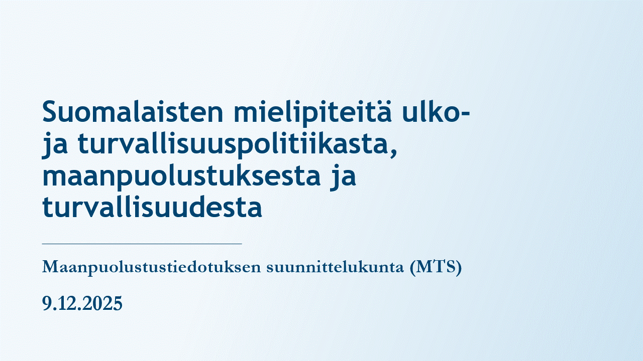 Joulukuussa2025 julkaistun ”Suomalaisten mielipiteitä ulko- ja turvallisuuspolitiikasta, maanpuolustuksesta ja turvallisuudesta” –tutkimuksen yhteyteen tehtiin keskeisiä tuloksia kuvaava esitysmateriaali, sekä tähän pohjautuvat aineistot somejulkaisuja varten.